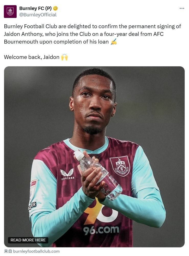官方:伯恩利从伯恩茅斯直接买断杰登-安东尼,双方合同期为四年
